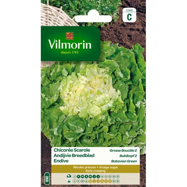 Andijvie Breedblad Grosse Bouclée 2, dit is de vroegste andijvie, oogsten is mogelijk vanaf mei. Vormt prachtige, volle kroppen met klokvormige bladeren en een goedgevuld hart met bleke bladeren.