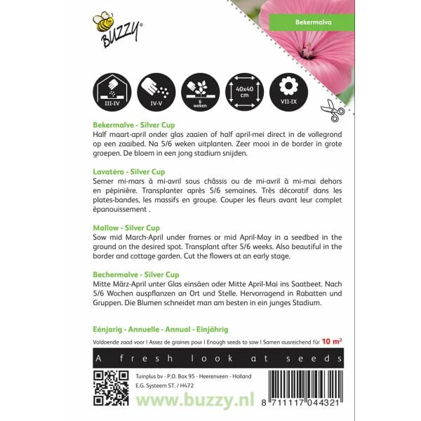 Silver Cup is een rose en rijkbloeiende eenjarige ‘bekermalva’ De grote trechtervormige, glanzende bloemen verschijnen lange tijd onafgebroken aan de planten die 100 cm hoog worden. Een juweel in jouw tuin.