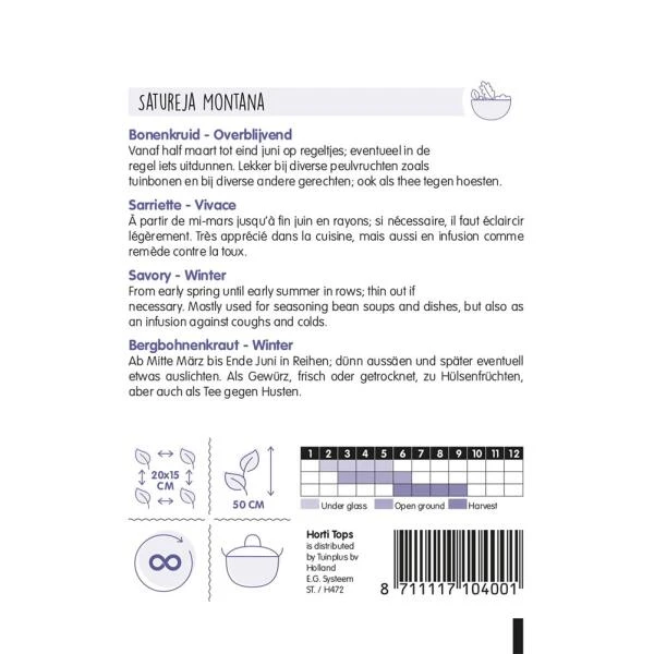 Bonenkruid is een ideaal kruid voor gerechten met peulvruchten. Het wordt ook gebruikt om soepen en sauzen op smaak te brengen of toe te voegen aan azijn op fles. Het is een overblijvende vaste plant met paars- rode, rode tot witachtige bloemen. Het eerste jaar éénmalig in september oogsten.