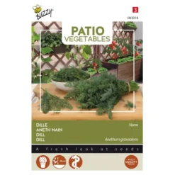 Dille Nano is een compact ras met een uitstekende bladproductie. Ideaal om te kweken in potten of bakken op het terras of balkon. Dille kan je ook binnen zaaien en dat het jaarrond. Het blad is niet alleen een heerlijke smaakmaker bij visgerechten of in combinatie met roomkaas en sauzen maar ook de bloemen zijn eetbaar. De zaden van dille kan je gebruiken in marinades en bij het inmaken van groenten. De plant past ook in de siertuin als waardplant voor vlinders.