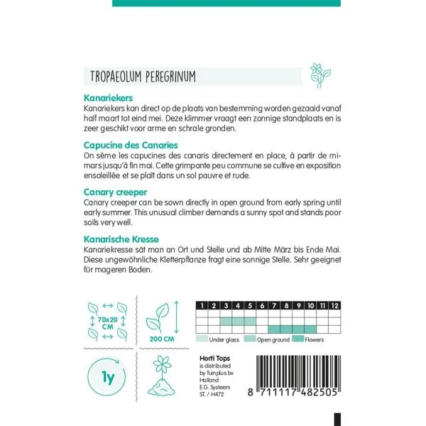 Bloeit reeds ca. 70 dagen na het zaaien. De kanariekers bloeit de gehele zomer.