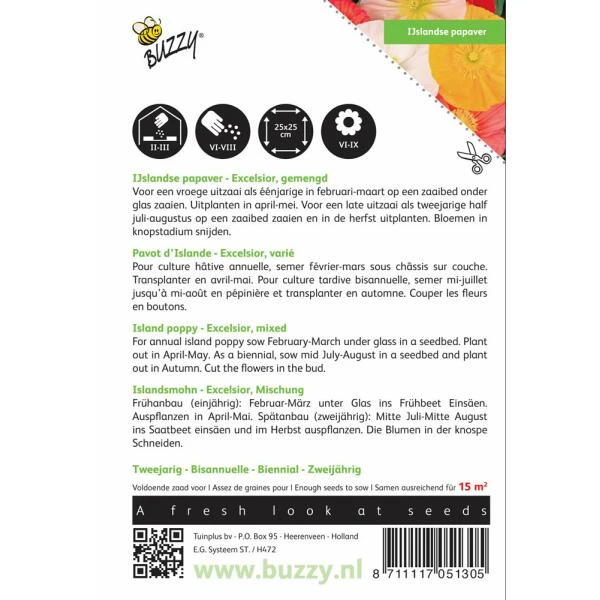 Deze IJslandse papavers zijn meerjarig maar worden tweejarig geteeld. De bloei, in verukkelijke pasteltinten, is hierdoor veel rijker. Heel mooi in groepen in perk en als rand.