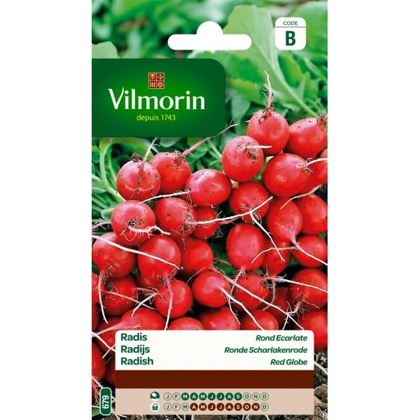 Vroege variëteit voor de volle grond, vormt mooie ronde en donkerrode radijsjes.