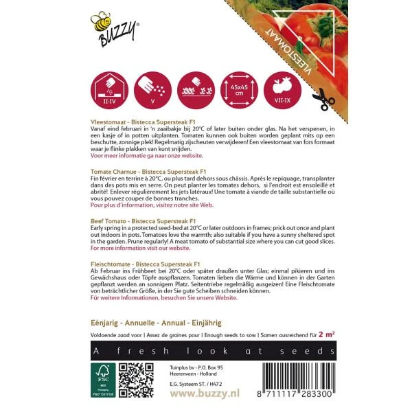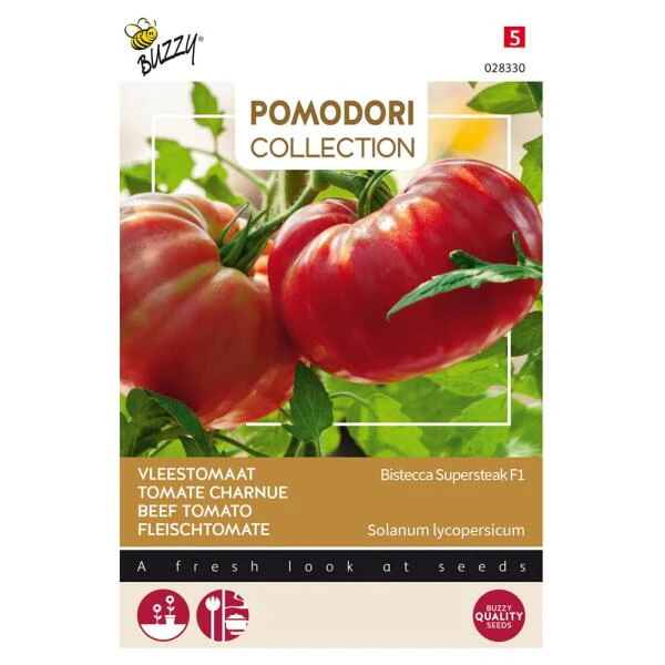 Tomaten Pomodori Bistecca F1, zoals de naam het al zegt een steaktomaat, een vleestomaat van fors formaat waar je flinke plakken kunt afsnijden.