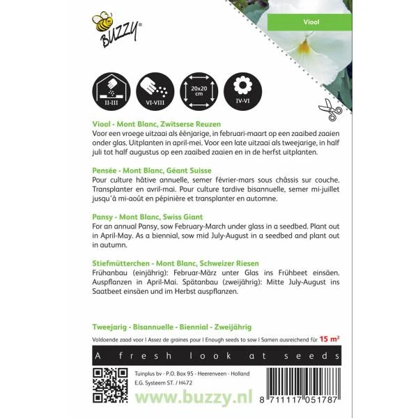 Deze grootbloemige violen kunnen zowel een- als tweejarig worden geteeld. Ze voldoen hierdoor uitstekend in randen, perken, borders en bloempotten en bloembakken. ‘Mont Blanc’ is een selectie uit de ‘Zwitserse Reuzen’ groep.