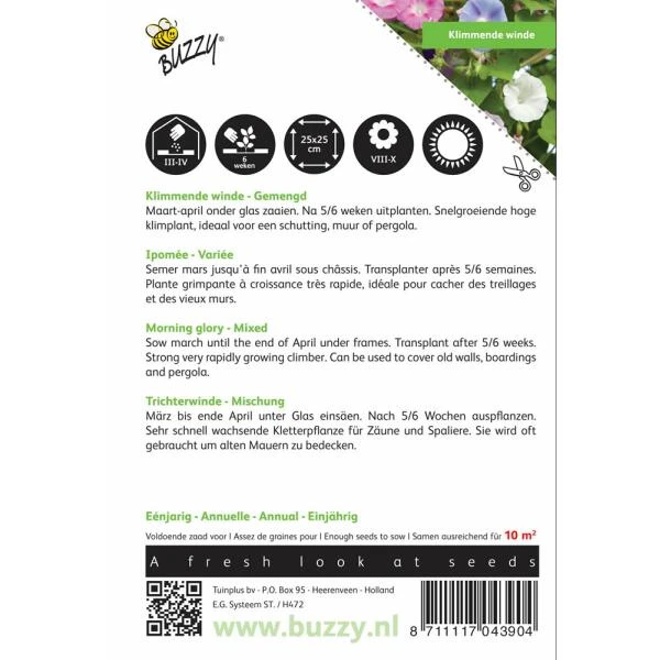 Klimmende winde, pronkwinde, dagbloem allemaal namen voor deze schitterende bloeiende eenjarige klimplanten. Ze worden gemakkelijk 3 meter hoog en bloeien fantastisch in witte, rose, rode, lila en purperen tinten en mengkleuren. De bloemen zijn groot trechtervormig.